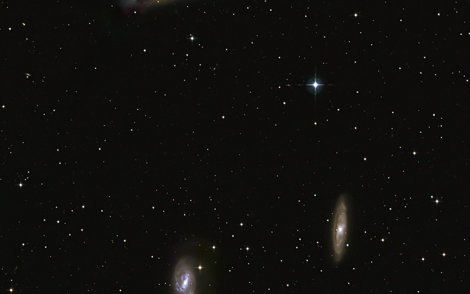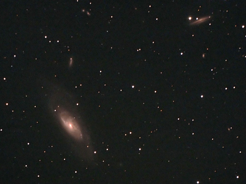 Galaxien M65, M66 und NGC3528, Bildautor: Helmut Metz, Aufnahmeort: E-Bergerhausen, Aufnahmedatum: 12.02. und 05.03.2021, Kamera: Canon EOS 450Da bei ISO 800, Objektiv: 500mm-Pentax-SDHF, Filter: CLS-Clip, Belichtungszeit: 22x4min, Blende: 6,7.